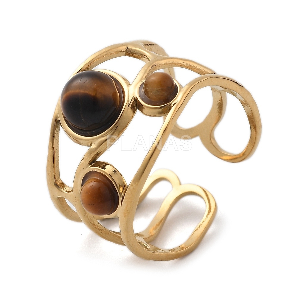 Anel em aço inoxidável 304 com banho de ouro e detalhe em olho de tigre.