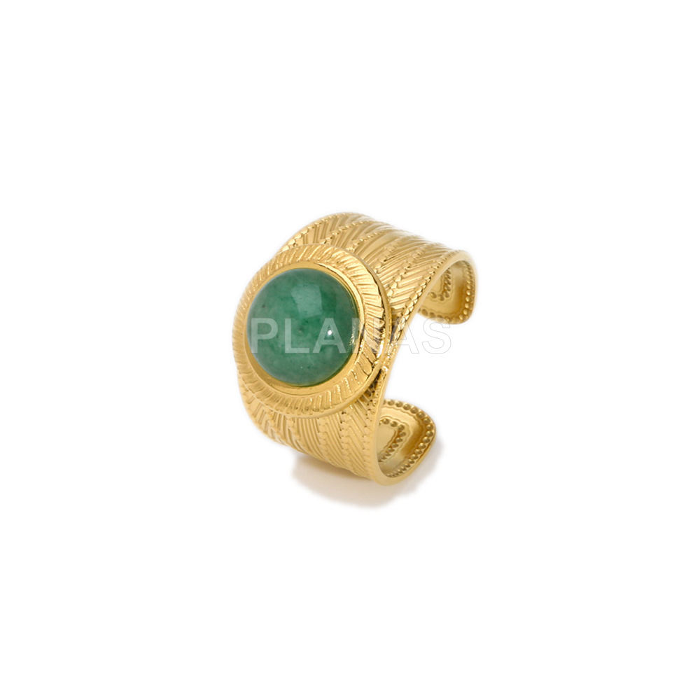 Anel em aço inoxidável 304 com banho de ouro 18k e aventurina verde.