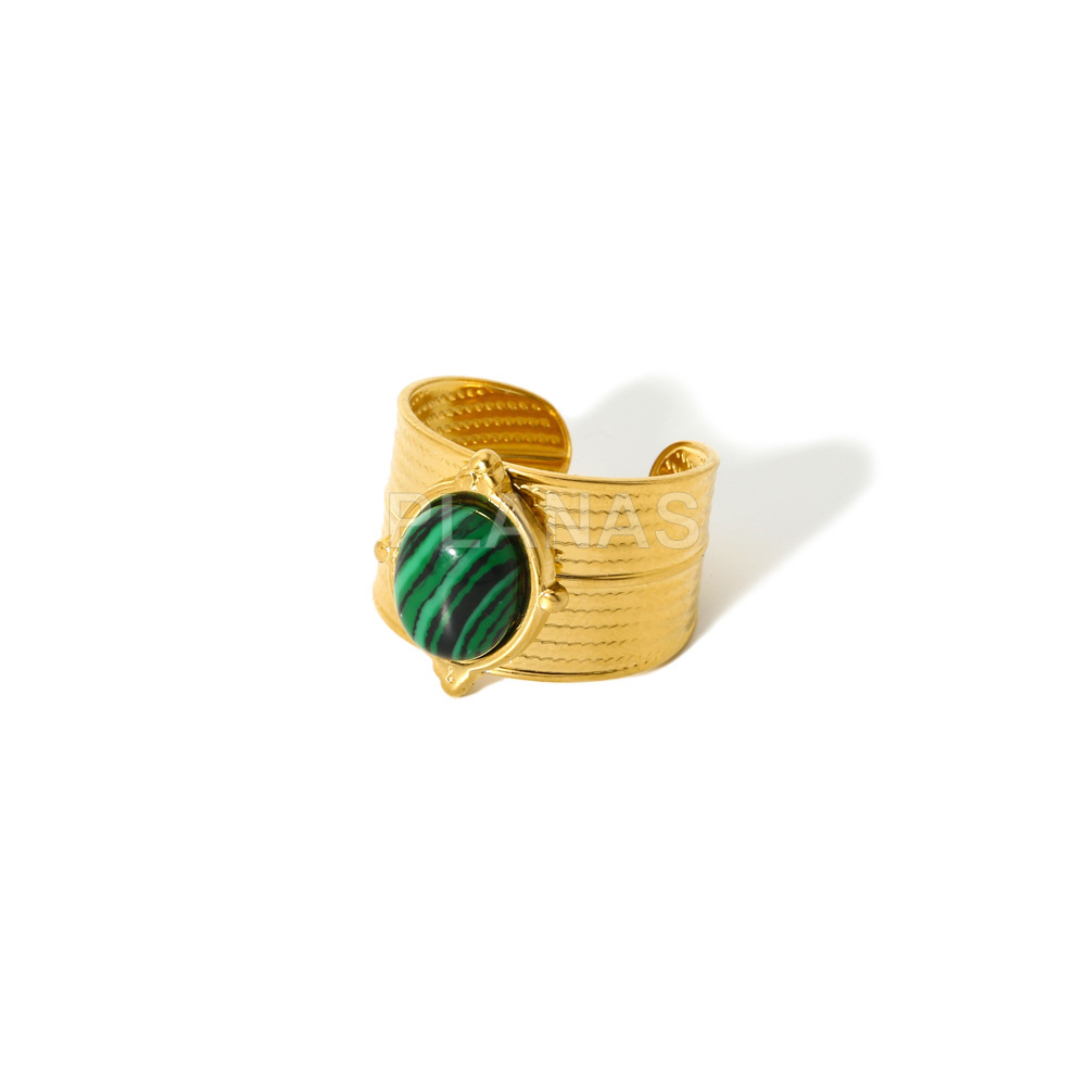 Anel em aço inoxidável 304 com banho de ouro e cravejado com malaquita.